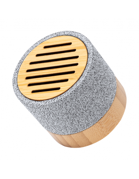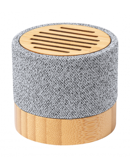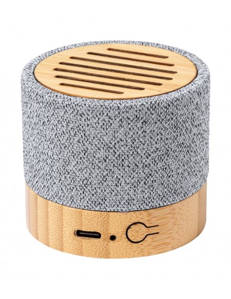 Bluetooth speaker in RPET polyester fabric covered bamboo housing, with built-in rechargeable battery. Including USB charger cable.