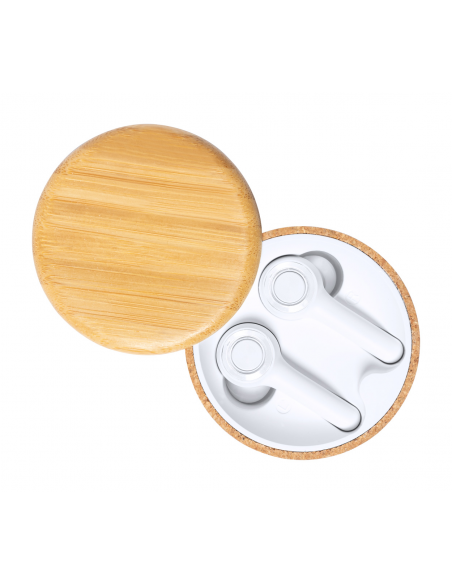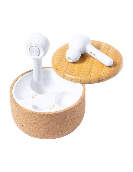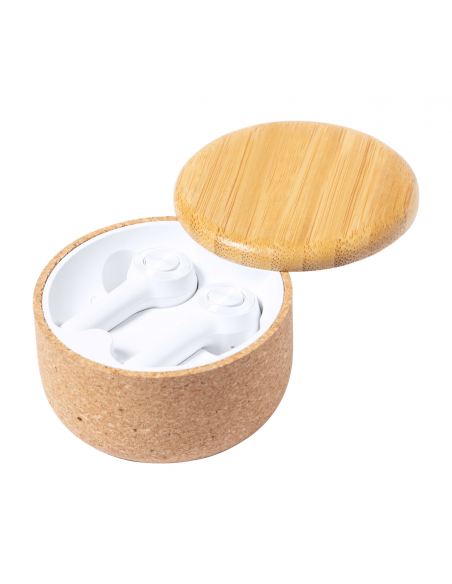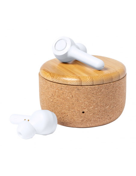 Wireless bluetooth earphones with hands-free call function. In cork and bamboo charger case. Including USB charger cable.