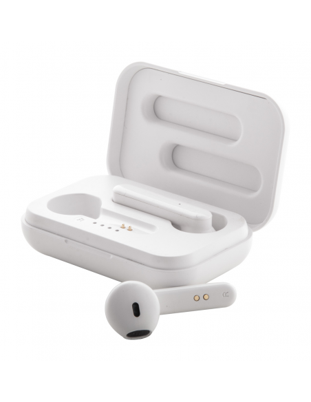 Antibacterial wireless bluetooth earphones with hands-free call function in plastic charger case. ISO 22196 compliant. Including USB charger cable.