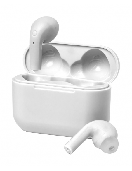 Active noise cancelling, wireless bluetooth earphones with hands-free call function in ABS plastic charger case. Including USB charger cable.