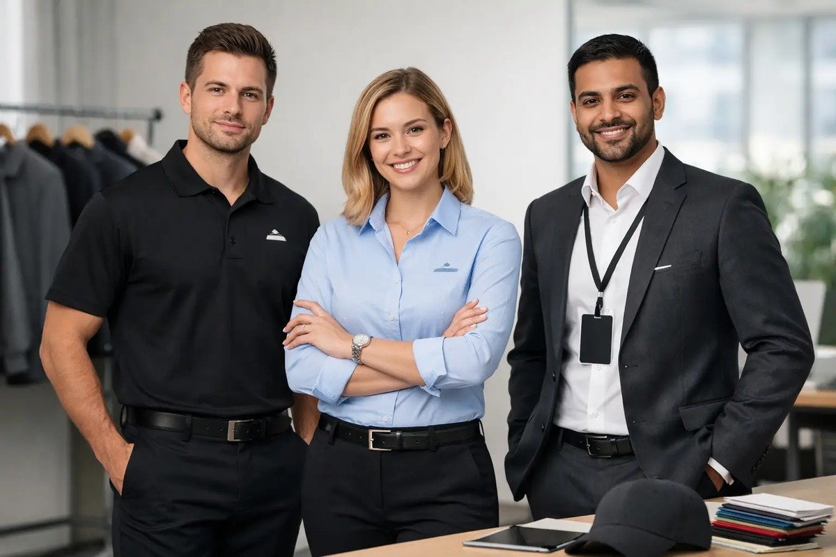 Dažniausiai tinka polo marškinėliai, džemperiai ir softshell striukės. Pasirinkimas priklauso nuo darbo aplinkos, sezoniškumo ir reprezentacijos lygio.