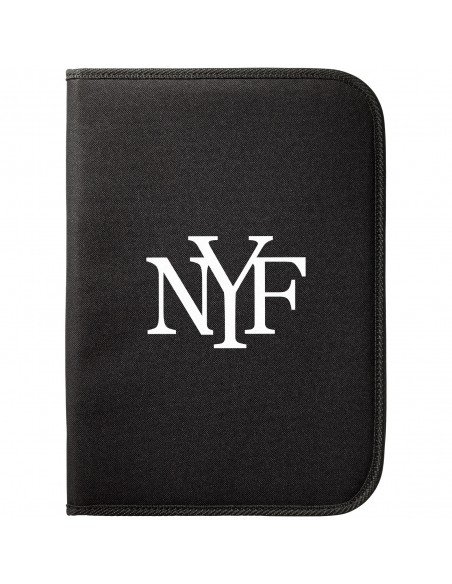 A4 sized, 300D RPET polyester document folder with built-in magnetic wireless fast charger (10W), 5000 mAh power bank with USB charger port, foldable mobile holder and 20 lined sheets notepad. Including self-adhesive metal ring to use the magnetic function on any wirelessly chargeable device. Including USB charger cable.
