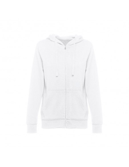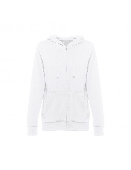 50% cotton and 50% polyester women's sweatshirt (320 g/m²) with carded interior. The hood is lined and contains colour cord closure. The front area has two marsupial pockets with plastic cover closure. Piece with cuffs and ribbon waistband. Sizes: S, M, L, XL, XXL