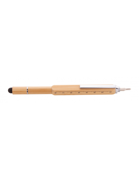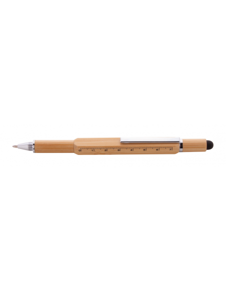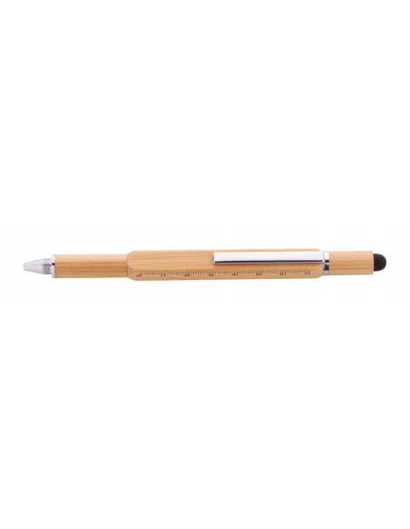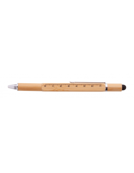 Multifunctional, twist ballpoint and touch pen in bamboo. With double ended screwdriver bit, spirit level and 7 cm ruler. With blue refill.