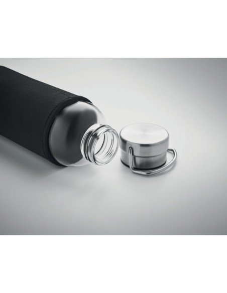 Glass bottle with stainless steel handle lid and neoprene pouch. Not suitable for carbonated drinks. Leak free. Capacity: 500 ml.