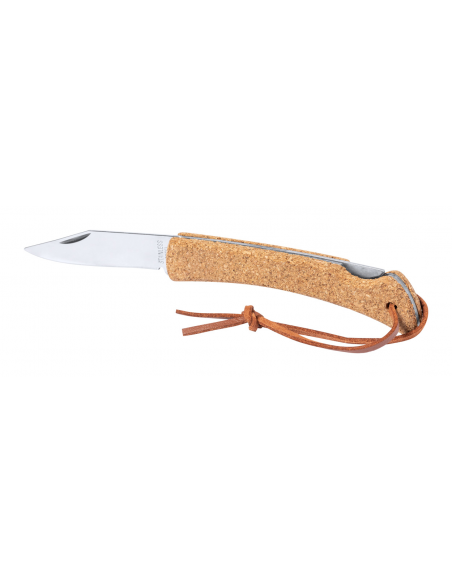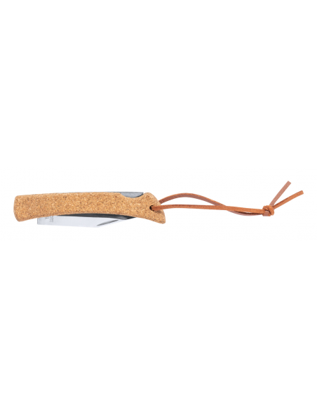 Stainless steel pocket knife with natural cork handle and PU leather carry strap. With safety lock.