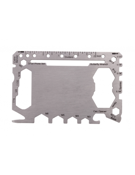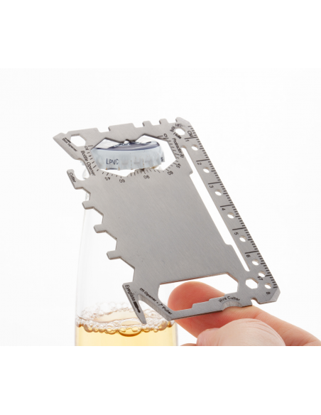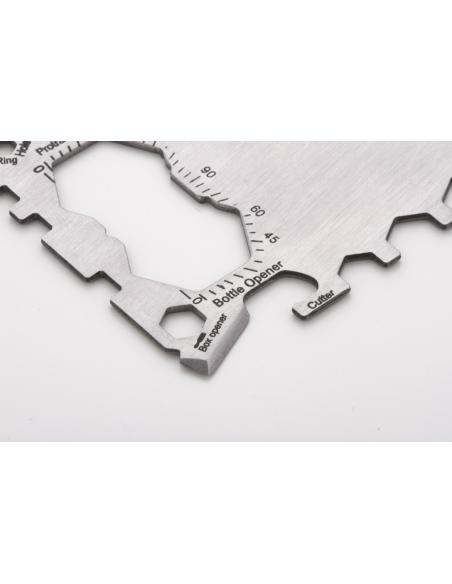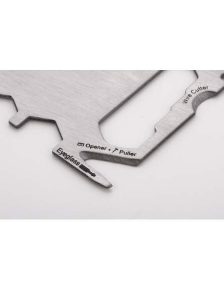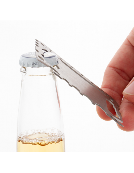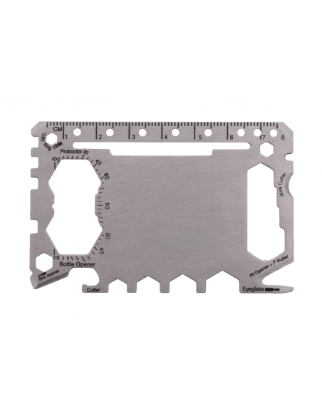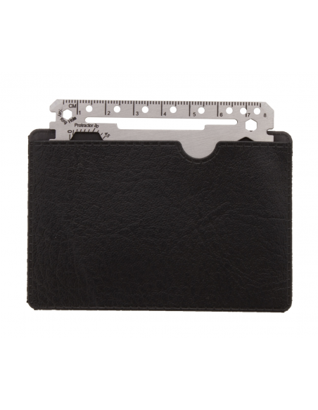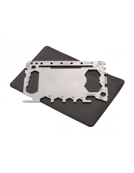 Stainless steel, credit card shaped multi tool with 20 functions, in PU leather pouch.
