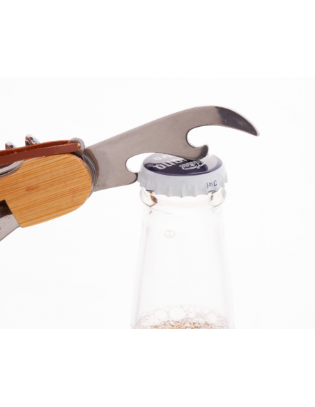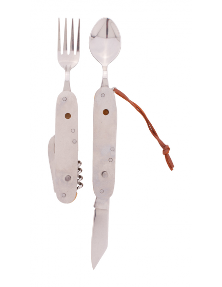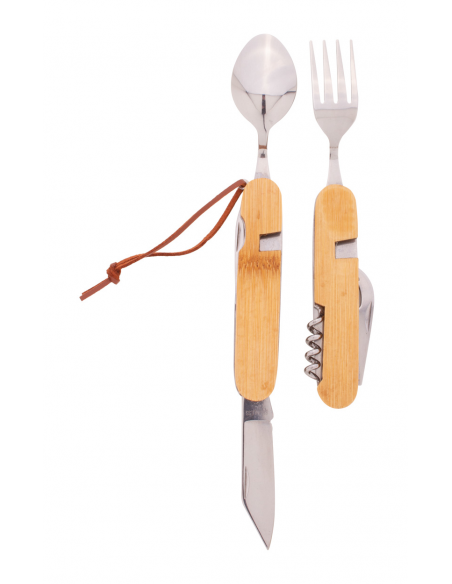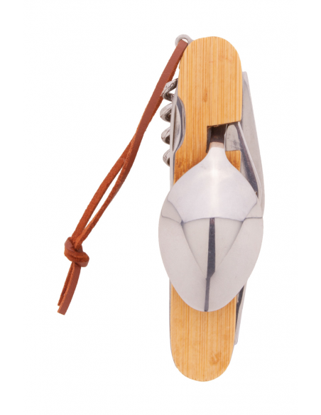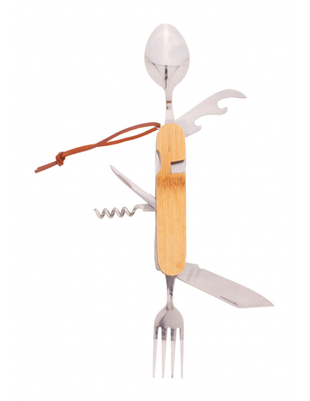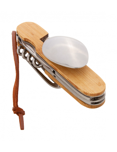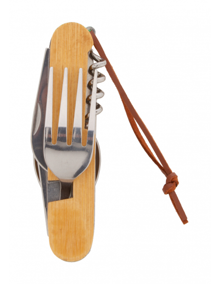 Stainless steel multifunctional pocket knife and folding cutlery set with bamboo handle and PU leather string. With 7 functions: knife, fork, spoon, bottle and can opener, corkscrew and leather puncher. Separates into 2 parts when used as cutlery.