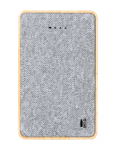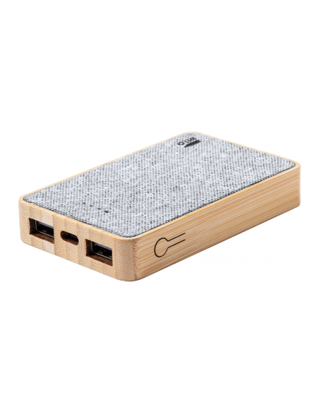 Bamboo power bank with RPET polyester fabric front and 5000 mAh battery. With 2 USB and 1 USB-C charger ports. USB-C input port. Including USB charger cable.