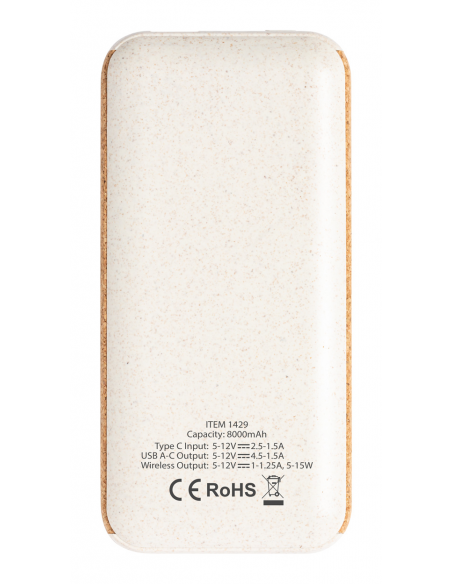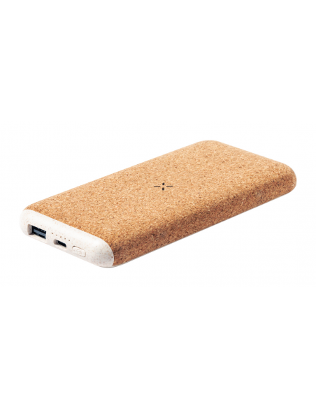 10.000 mAh power bank made from bamboo, featuring an ON/OFF touch button and 4 LED indicators to show the remaining battery capacity. Micro USB input 5V/2A, Type-C input 5V/3A, Type-C output 5V/3.1A max, dual USB-A output 5V/3.1A max, total power 15.5W. Delivered with a 30 cm TPE 3A Type-C to Type-C charging cable, an instruction manual and a kraft paper...