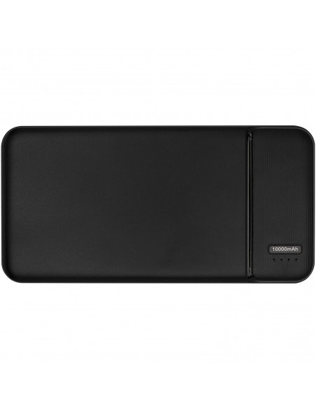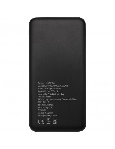 Power bank made of recycled ABS plastic. The power bank contains a long lasting grade A 10.000 mAh lithium polymer battery for fast charging. The power indicators will indicate the remaining energy level so you always know when to recharge. Type-C input 5V/2A, Micro USB input 5V/2A, dual USB-A output 5V/2A, total power 10W. Delivered with a 30 cm TPE 2A USB-A to Type-C charging cable, an instruction manual and a kraft paper gift box.
