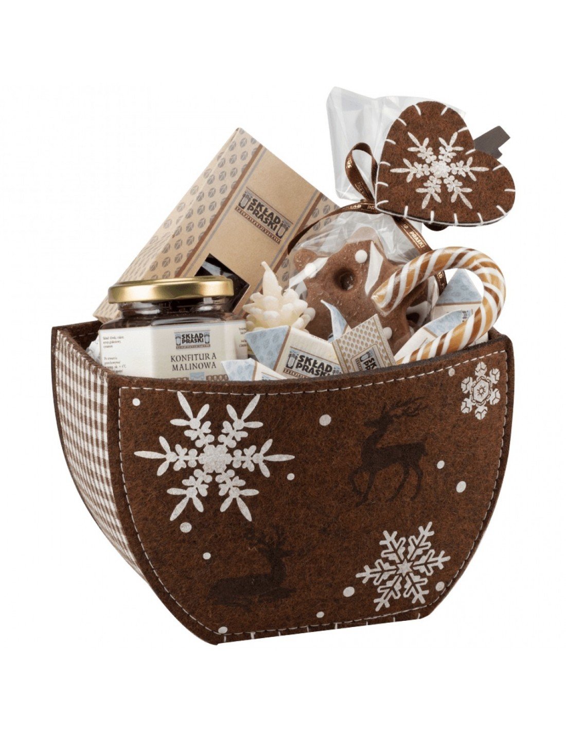 Rinkinį sudaro: migdolai šokolade, rankomis dekoruota meduolinė Kalėdų eglutė, aviečių džemas, tradicinis sviestinis saldainis, karamelinė lazdelė ir žvakė dekoruotame krepšelyje.