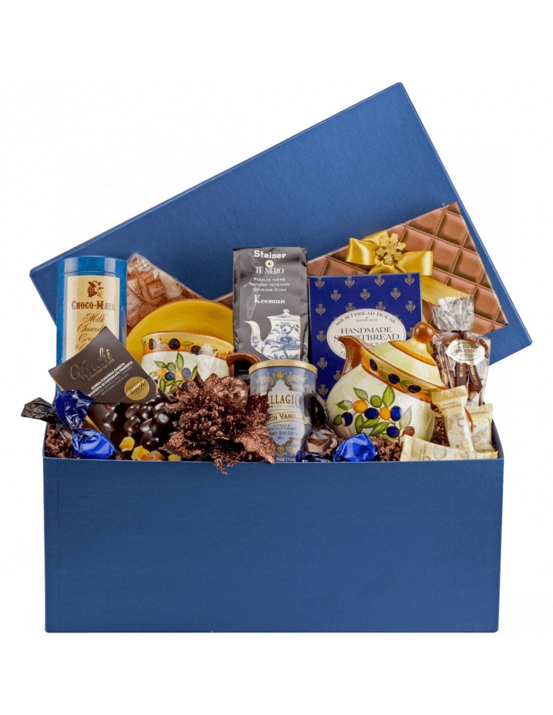 Kalėdinis asorti uždaroje dėžutėje, sudarytas iš šokoladinių saldainių, angliškų sviestinių sausainių, riešutų karamelėje, citrininės nugos su riešutais ir razinomis, Dardžilingo juodosios arbatos, apelsinų žievelių cukatų šokolade, arbatinuko ir puodelio, servetėlių, Choco Maya šokoladinių dribsnių, vanilės skonio šokoladinio gėrimo bei cinamono ir žemės riešutų saldainių.