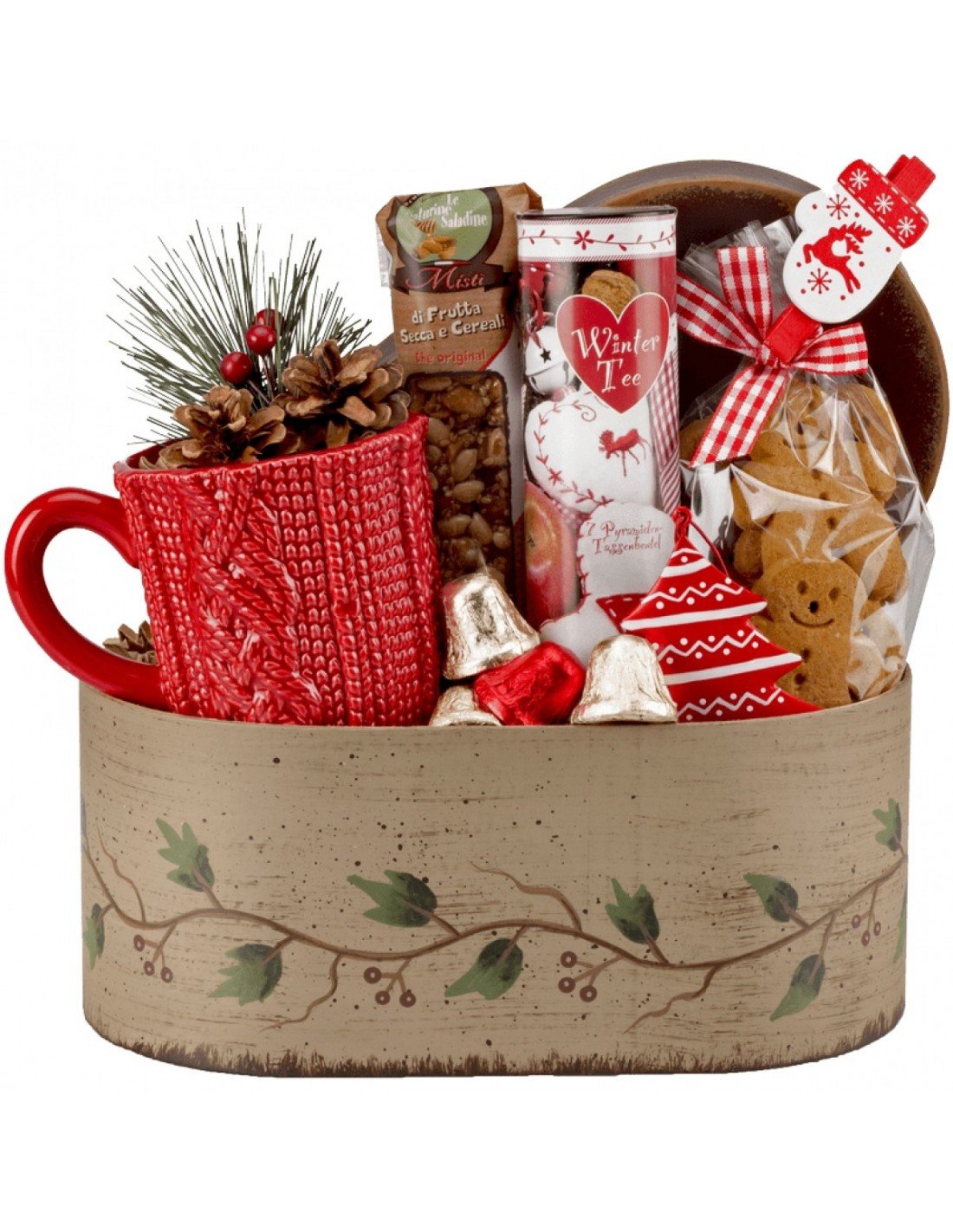 Imbierinis meduolis "Mr. Cookie", žieminė arbata, džiovinti vaisiai ur riešutai meduje, šokoladiniai varpeliai užpildyti kremu ir Kalėdinis puodelis - viskas vienoje, uždaroje, dekoruotoje dėžutėje!