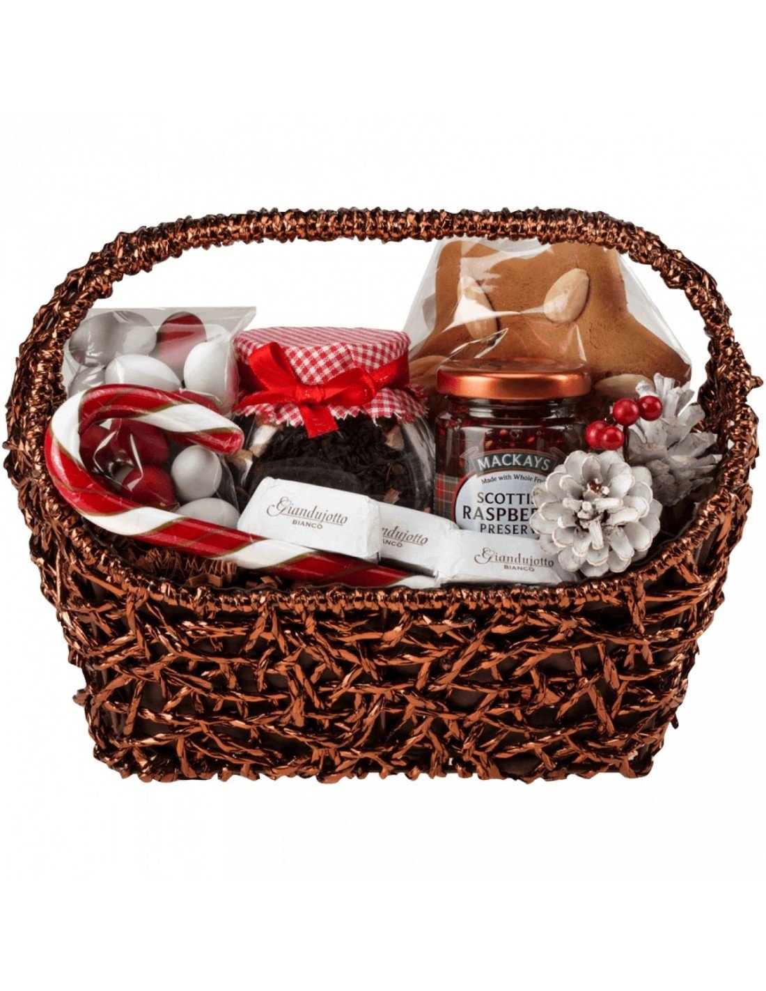 Rankomis dekoruotas imbierinis meduolis Kalėdų eglutė su migdolais, apelsinų žievelių arbata, škotiška spanguolių uogienė, migdolai šokolade, karamelinė lazdelė ir giandujotti saldainiai baltos spalvos šokoladu - viskas viename papuoštame krepšelyje!