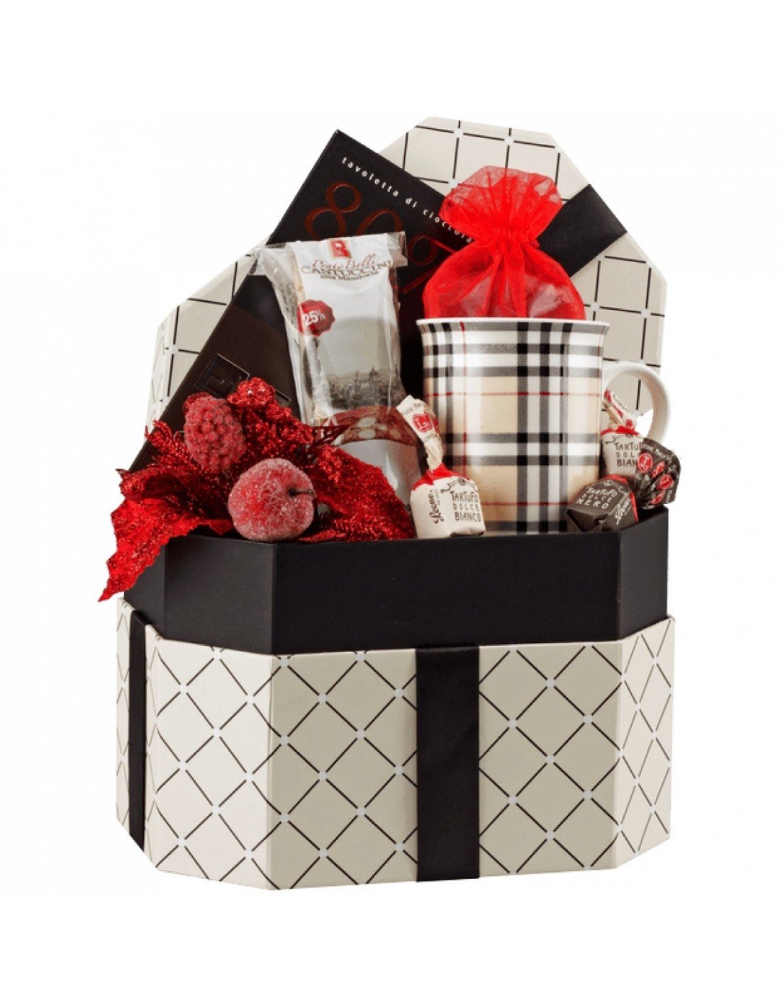 Plytelė desertinio šokolado su 80% kakavos, itališki biscotti sausainiai su migdolais (25%), balto ir desertinio šokolado triufeliai, puodelis, Kalėdinė arbata su apelsinų žievelėmis - viskas vienoje, uždaroje, dekoruotoje dėžutėje!
