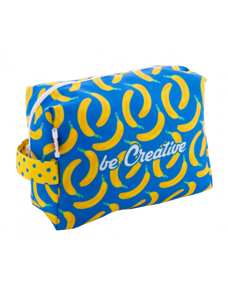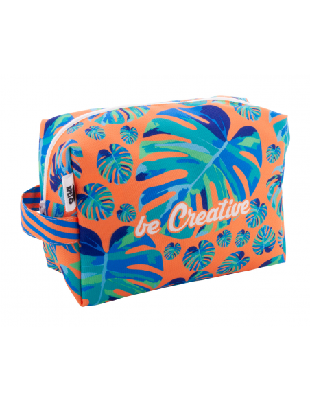 Custom made, zipped RPET cosmetic bag in 600D RPET polyester with carry handle. With all-over sublimation printed graphics. MOQ: 50 pcs.