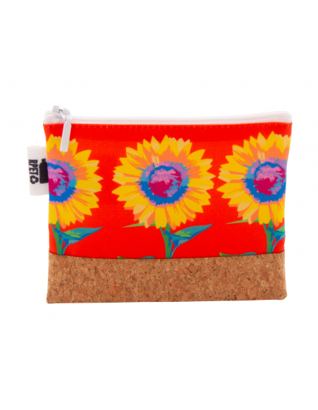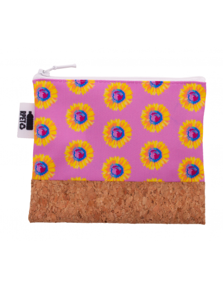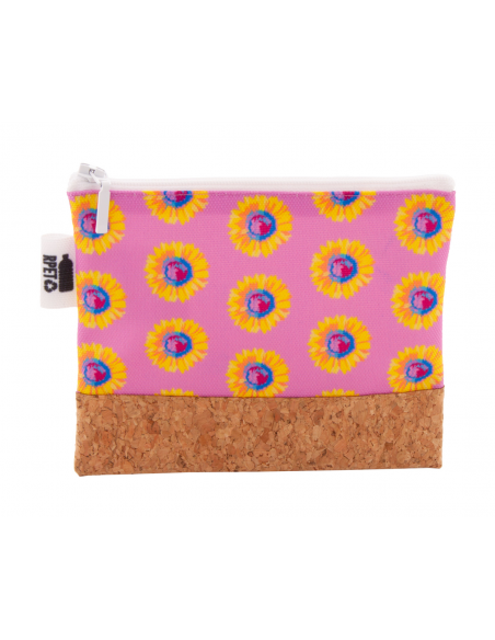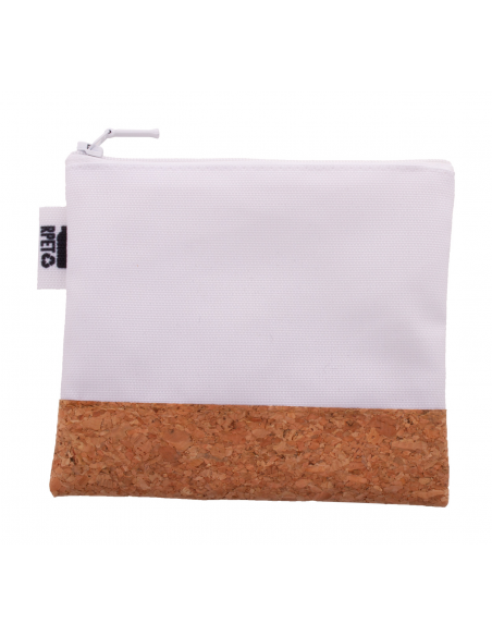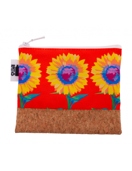 Custom made, zipped cosmetic bag in 600D RPET polyester and natural cork. With all-over sublimation printed graphics. MOQ: 50 pcs.