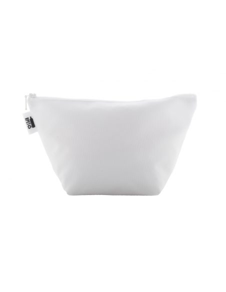 Custom made, zipped cosmetic bag in 600D RPET polyester. With distinctive RPET label and all over sublimation printed graphics. MOQ: 50 pcs.