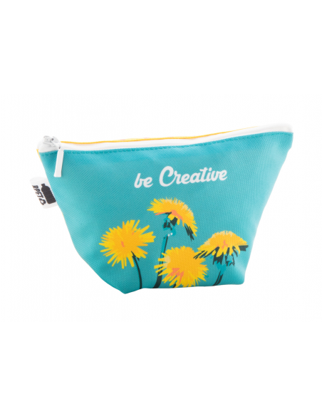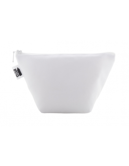 Custom made, zipped cosmetic bag in 600D RPET polyester. With distinctive RPET label and all over sublimation printed graphics. MOQ: 50 pcs.