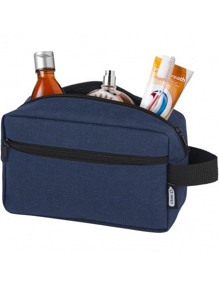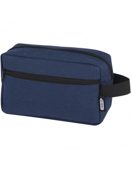 The Ross toiletry bag is the perfect travel companion for cosmetics and hygiene articles. It is manufactured with GRS certified recycled polyester, making it a more sustainable choice. Featuring a zipped main compartment, a front pocket, and a webbing loop. Capacity: 1.5 litres.