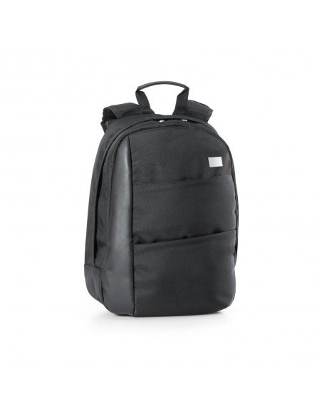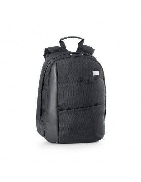 Laptop backpack in imitation leather and 1680D. Compartment with padded partition for laptop up to 15'6''. Lined and padded interior. It contains several interior pockets. The backpack has 2 front pockets and a customizable board. Padded straps and back with padded support system for the back. 340 x 450 x 130 mm | Plate: 40 x 20 mm