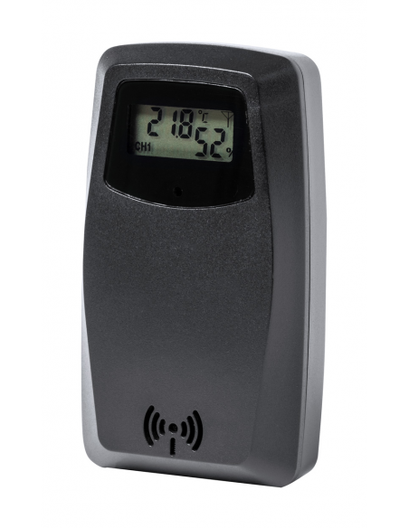 Digital clock and weather station in ABS plastic with colour display and wireless outdoor sensor. Operates with 2 AAA batteries, without batteries.