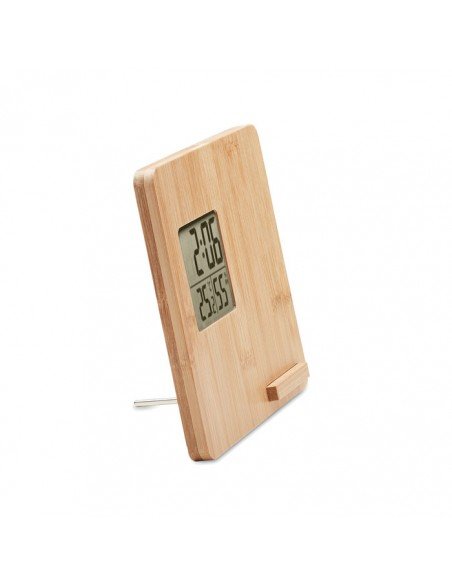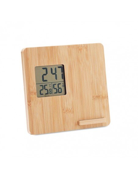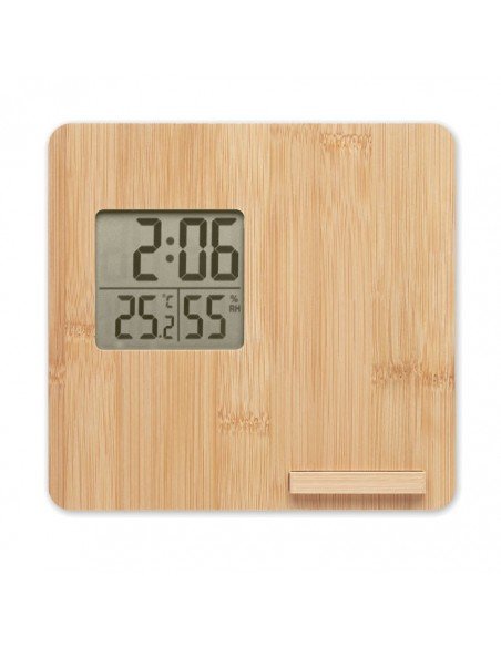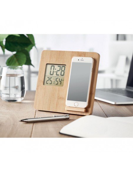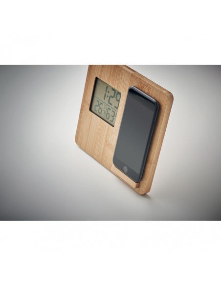 10W Wireless charger device including time, temperature and humidity display, smartphone stand function in bamboo casing. 1 CR2032 included. Wireless output: DC 9V/1.10A (10W) for quick charging. Compatible latest androids, iPhone® 8, X and newer.