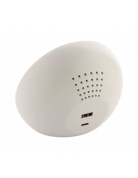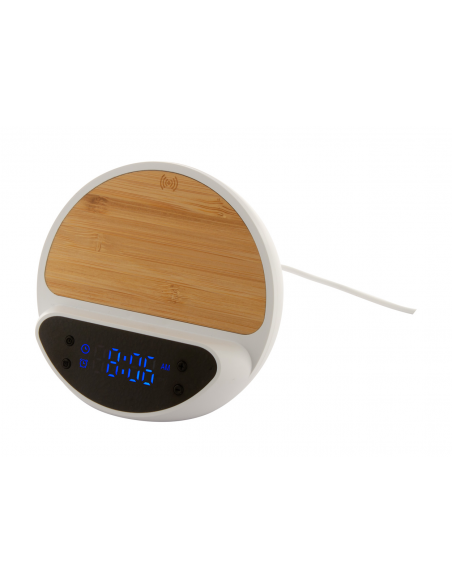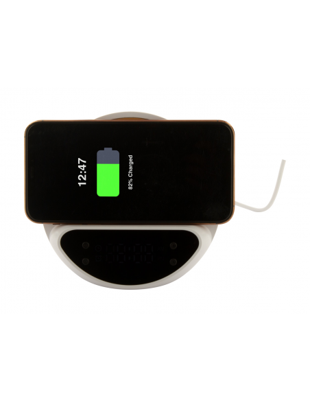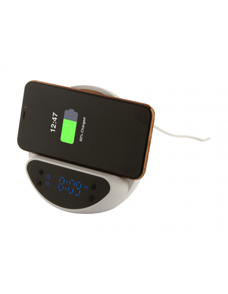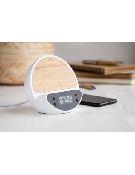 Digital alarm clock in recycled ABS and bamboo housing, with mobile phone holder and built-in wireless fast charger (15W). Including USB charger cable.