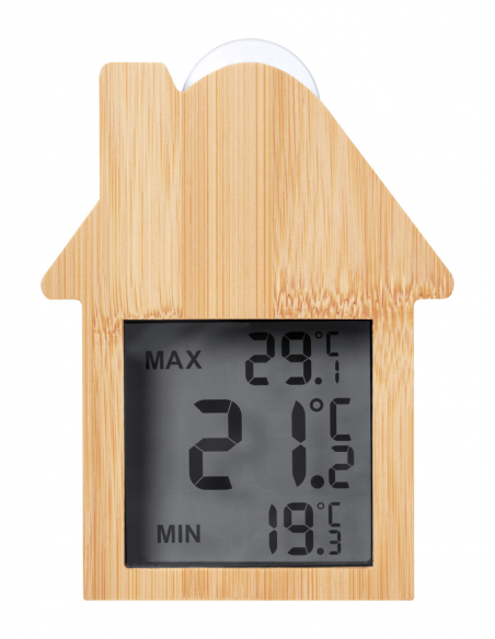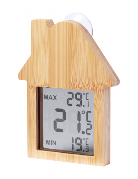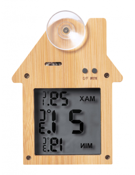 Bamboo weather station with suction cup. With thermometer and humidity display functions. Including button cell battery.
