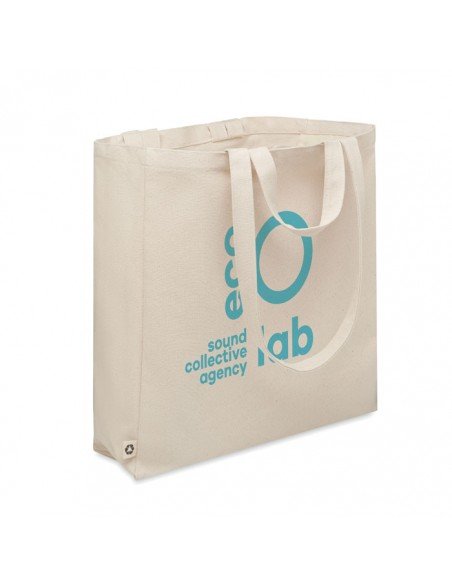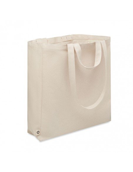 Recycled polycotton shopping or beach bag (70% recycled cotton, 30% recycled polyester) with short handles. It has a side zippered pocket 140 gr/m².