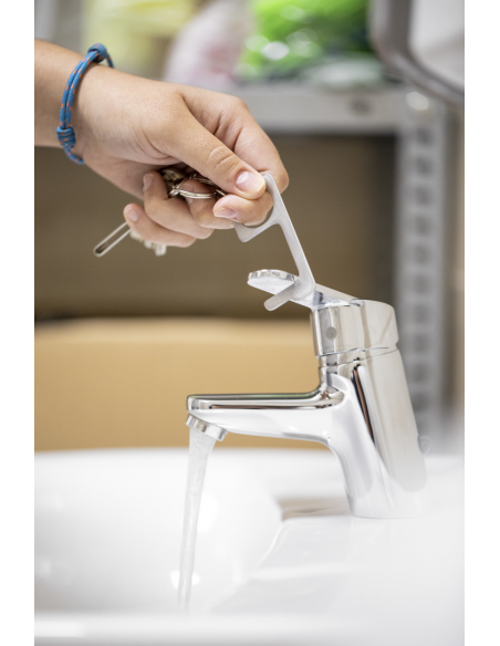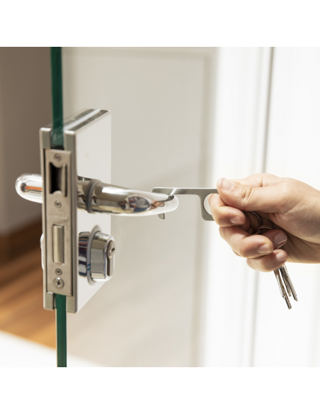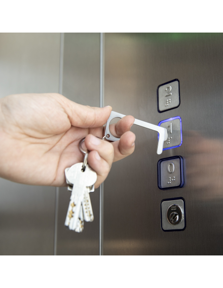 Practical stainless steel hygiene key with metal keyring. For pushing buttons and opening doors without direct contact.
