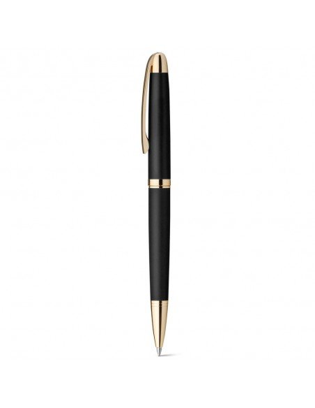 Metal ball pen with twist mechanism, clip and golden details. Supplied in a kraft paper case