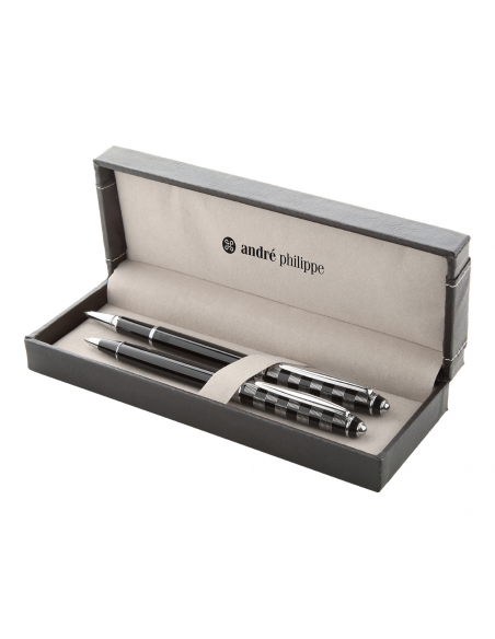 Metalinių tušinukų rinkinys CHECKED. Rinkinį sudaro: metalinis tušinukas su mėlynu rašalu ir keramika padengtas rašiklis su mėlynu užpildu, supakuoti dovanų dėžutėje. Dėžutės matmenys:18x4x6,5 cm Greitai ir kruopščiai atspausdinsime Jūsų logotipą arba reklaminį užrašą, paruošime maketą suderinimui.