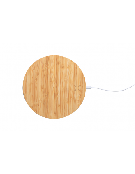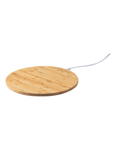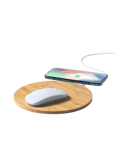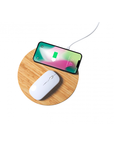Bamboo mouse pad with built-in wireless fast charger (10W). Including USB charger cable.