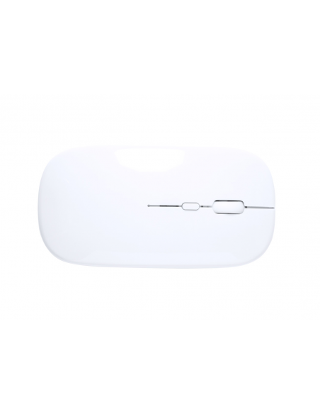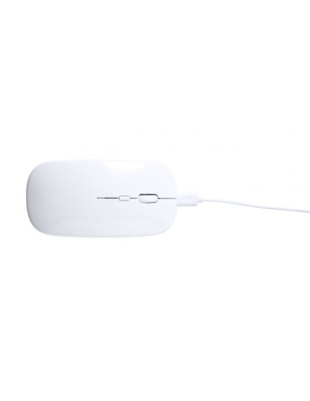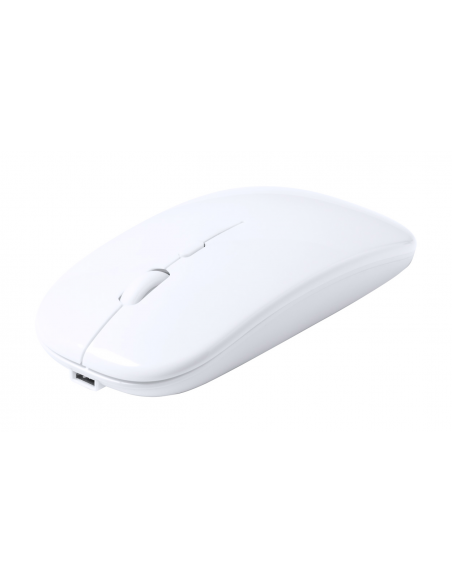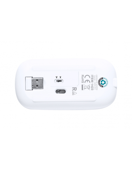 Wireless optical mouse with recycled ABS plastic housing and built-in rechargeable battery. Including USB charger cable.