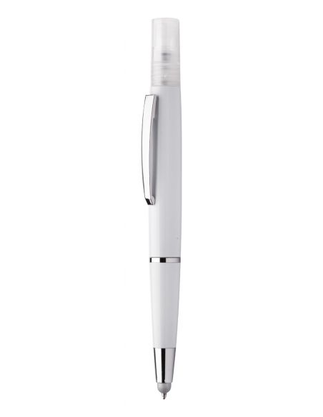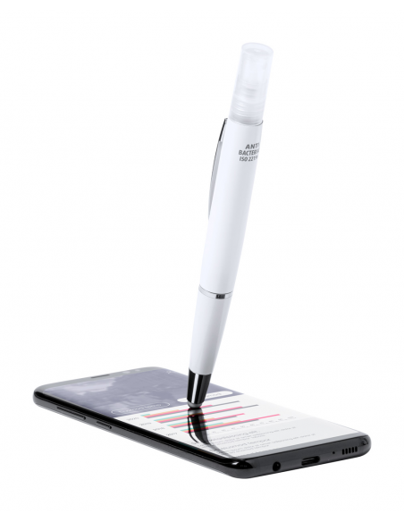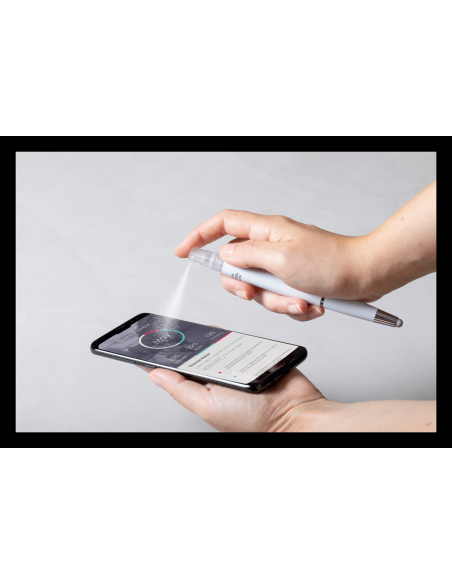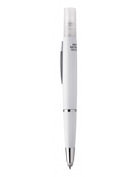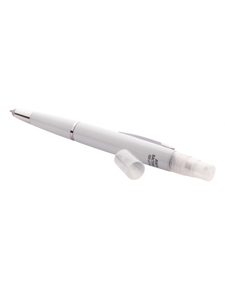 Anti-bacterial plastic ballpoint pen with blue refill and sanitizer spray on top. Capacity: 3 ml. Delivered without sanitizer liquid. ISO 22196 compliant.