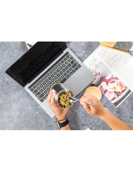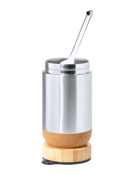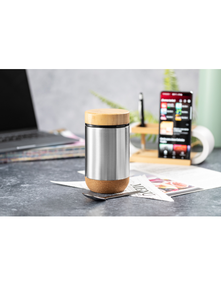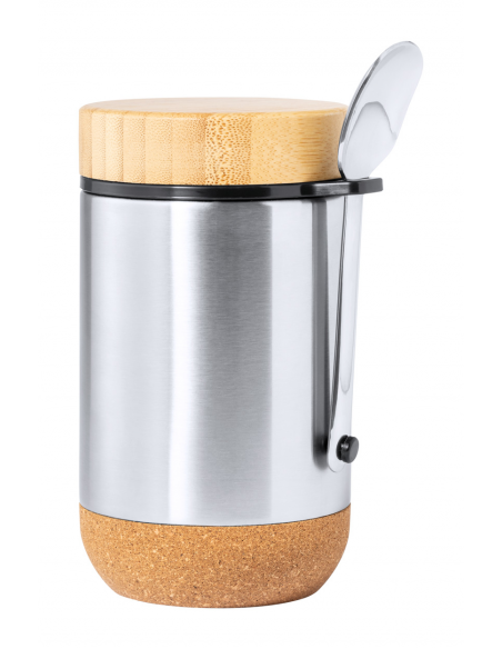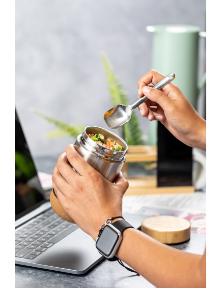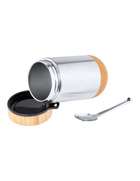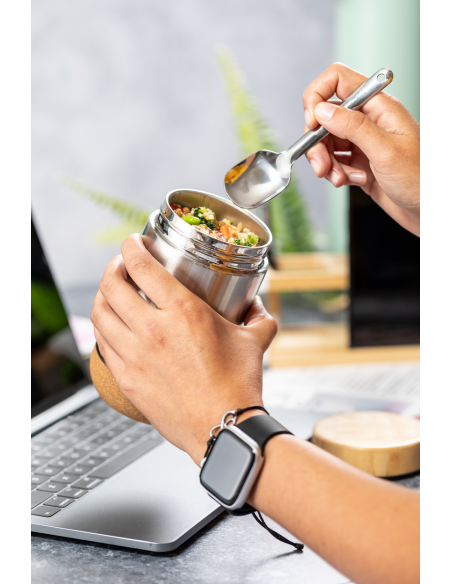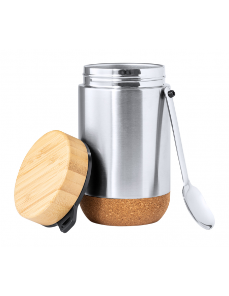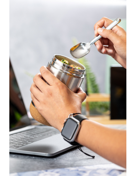 Stainless steel lunch box with natural cork base and bamboo lid, and stainless steel spoon. 450 ml.