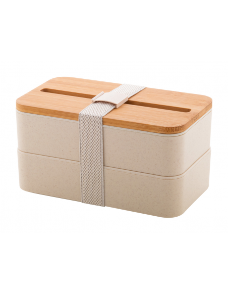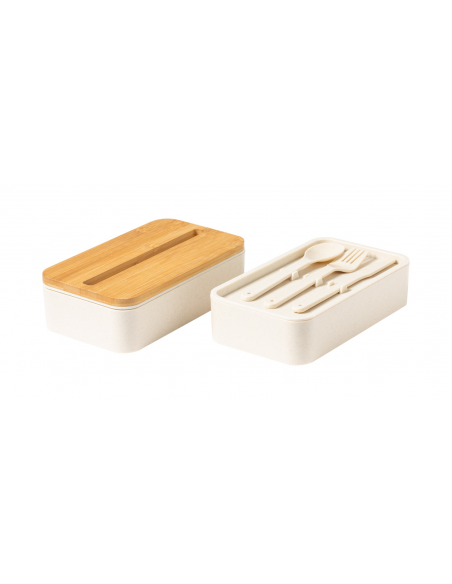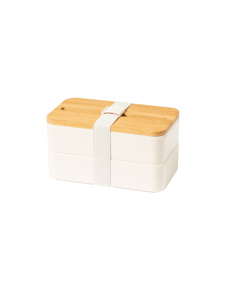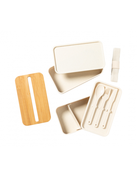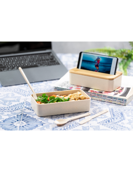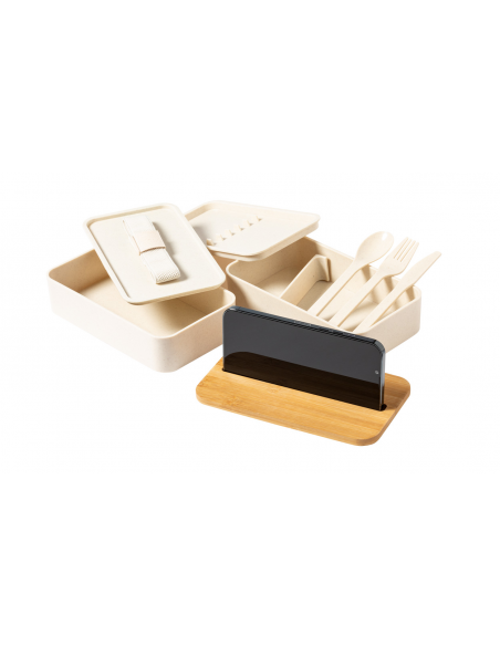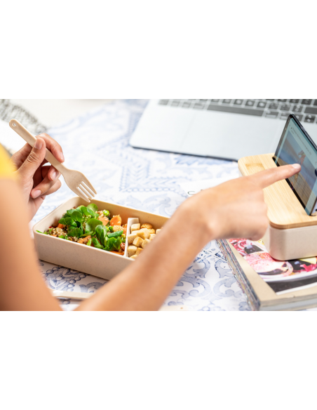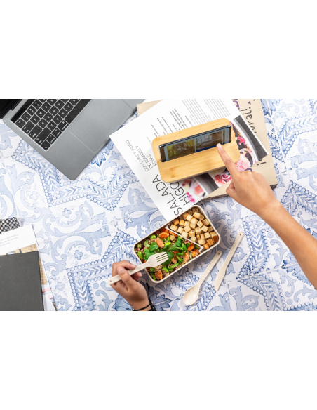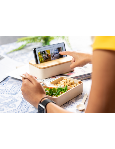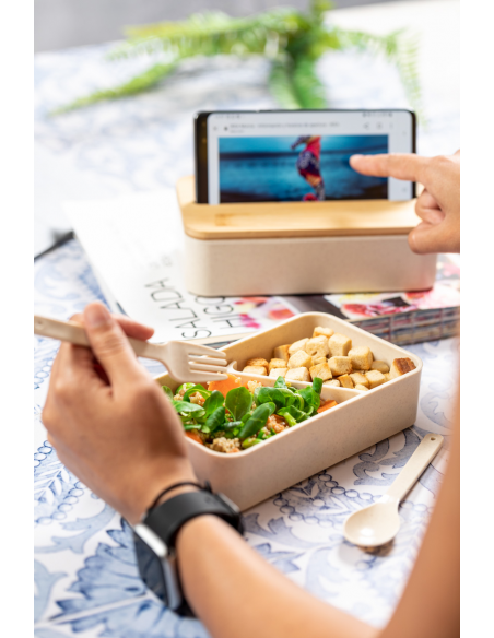 Lunch box in PP plastic with cutlery set (fork, spoon and knife), bamboo lid with mobile phone holder and elastic strap. With 2 compartments of 700 ml capacity each.
