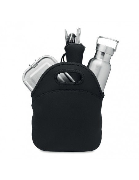 Lunch set presented in neoprene bag. Including Double wall stainless steel vacuum bottle (500 ml) , lunchbox (600 ml) and cutlery in zippered neoprene pouch.