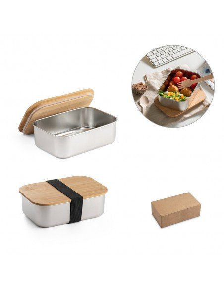 Stainless steel lunch box with bamboo lid and an elastic band for safe carrying. Capacity up to 800 mL. Supplied in kraft box. 165 x 115 x 52 mm