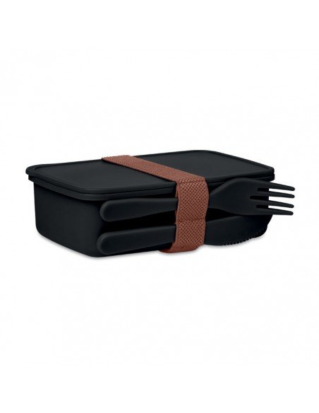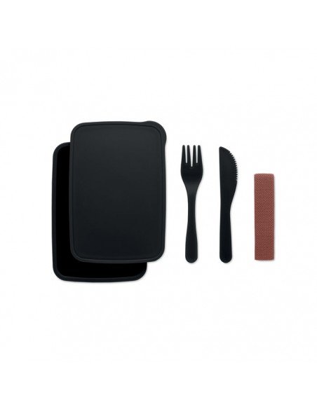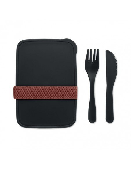 PP and PS lunch box with 2 compartments (680 mL each) and 1 removable divider. Includes 3 pieces of cutlery: fork, knife and spoon. Closes with an elastic band and is suitable for microwave (remove lid)