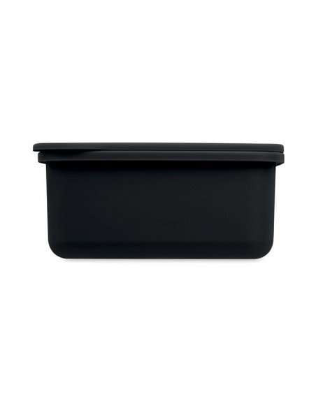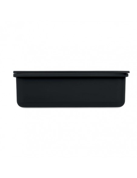 Retractable hermetic box in silicone and PP with 2 compartments and capacities up to 480 ml and 760 ml. On top of the lid there is a space to store one piece of tableware (included), with a 2 in 1 function, fork and spoon. The box is suitable for microwave use, with the lid having to be removed