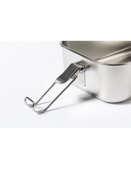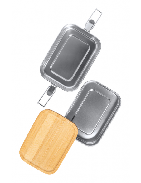 Recycled stainless steel lunch box with bamboo lid and secure buckle closure. With 2 compartments of 340 and 600 ml capacity.