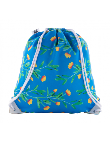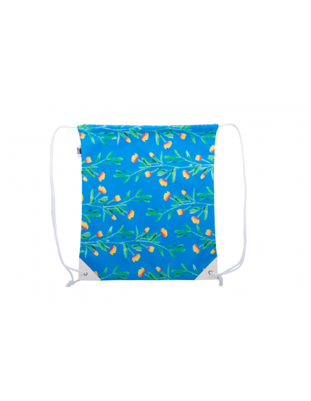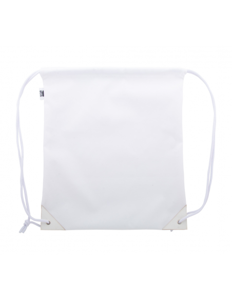 Custom made drawstring bag in 600D RPET polyester, with reinforced PU leather corners and thick matching colour strings. With all over sublimation printed graphics and distinctive RPET label. MOQ: 50 pcs.