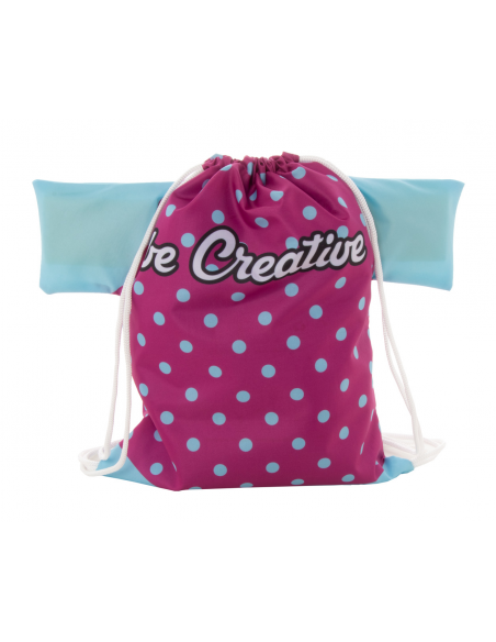 Custom made, T-shirt shaped drawstring bag for children with coloured strings, 190T polyester. With all over sublimation printed graphics. MOQ: 50 pcs.