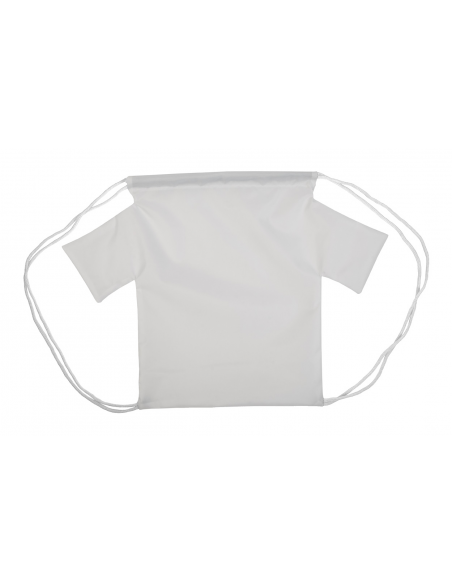 Custom made, T-shirt shaped drawstring bag with coloured strings, 190T RPET polyester. With all over sublimation printed graphics and distinctive RPET label. MOQ: 50 pcs.