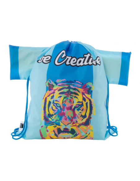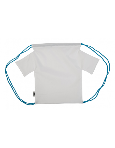 Custom made, T-shirt shaped drawstring bag with coloured strings, 190T RPET polyester. With all over sublimation printed graphics and distinctive RPET label. MOQ: 50 pcs.