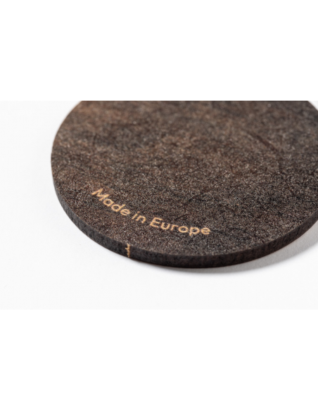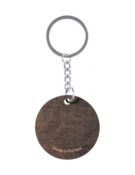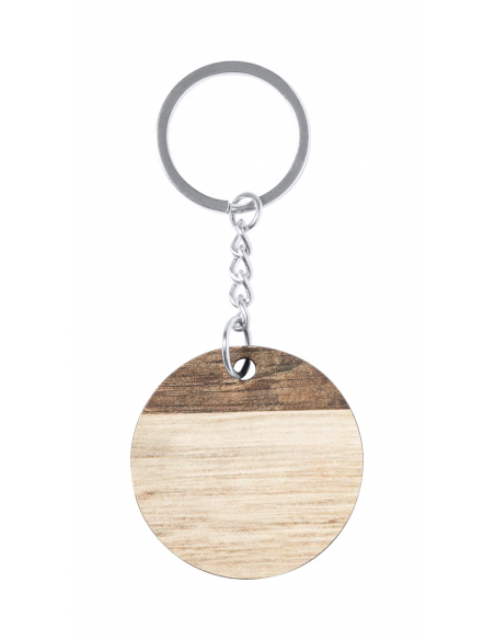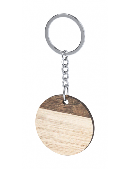 Round wooden keyring with metal ring and two-tone finish.