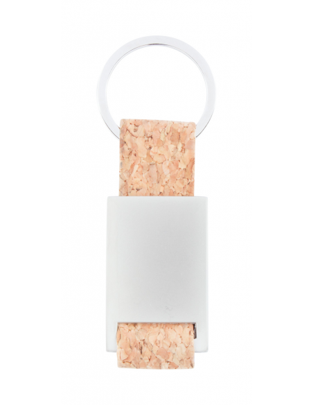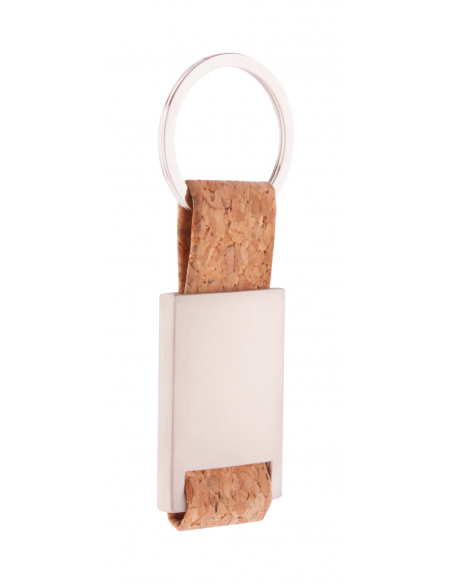 Rectangular metal keyring with natural cork strap and metal ring.